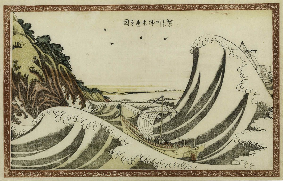 Kanagawa oki honmoku no zu (1804-1807), es considerada el prototipo de Katsushika Hokusai para La gran ola de Kanagawa. (Colección del Museo de Arte Sumida Hokusai)