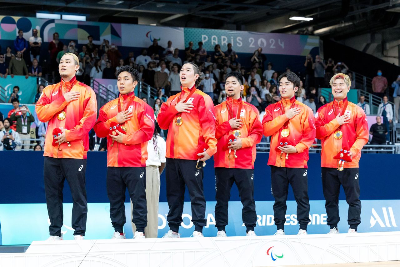Equipo de golbol masculino de Japón que participó en los Juegos Paralímpicos de París. En la fotografía se los observa cantando el himno nacional durante la entrega de la medalla de oro. Fotografía de Ochi Takao.