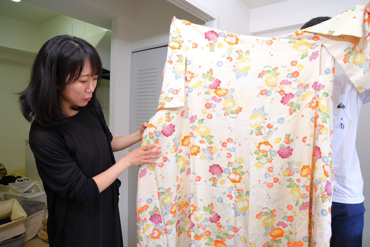 La mayoría de los kimonos están hechos de seda, con tejidos delicados que se deben lavar a mano con agua fría. Si están muy sucios se utiliza un poco de detergente; se tarda un cierto tiempo en quitar las manchas. Se secan a la sombra, se vuelven a lavar y se planchan. Lo siguiente es retirar las partes maltratadas. Dependiendo de la condición de cada kimono, se pueden sacar entre cinco y diez lienzos de tamaño adecuado para un hiyab.