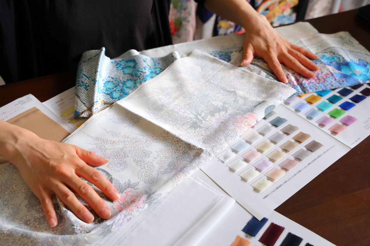 Los kimonos los consigue en tiendas de segunda mano que ya conoce. Como los diseños que Kobayashi considera que van bien con los hiyabs no son los más populares, los vendedores se alegran de poder vendérselos. Los hiyabs hechos con tela de kimonos antiguos son una forma creativa de reciclaje amigable con el medioambiente que se adecua perfectamente a nuestra época.