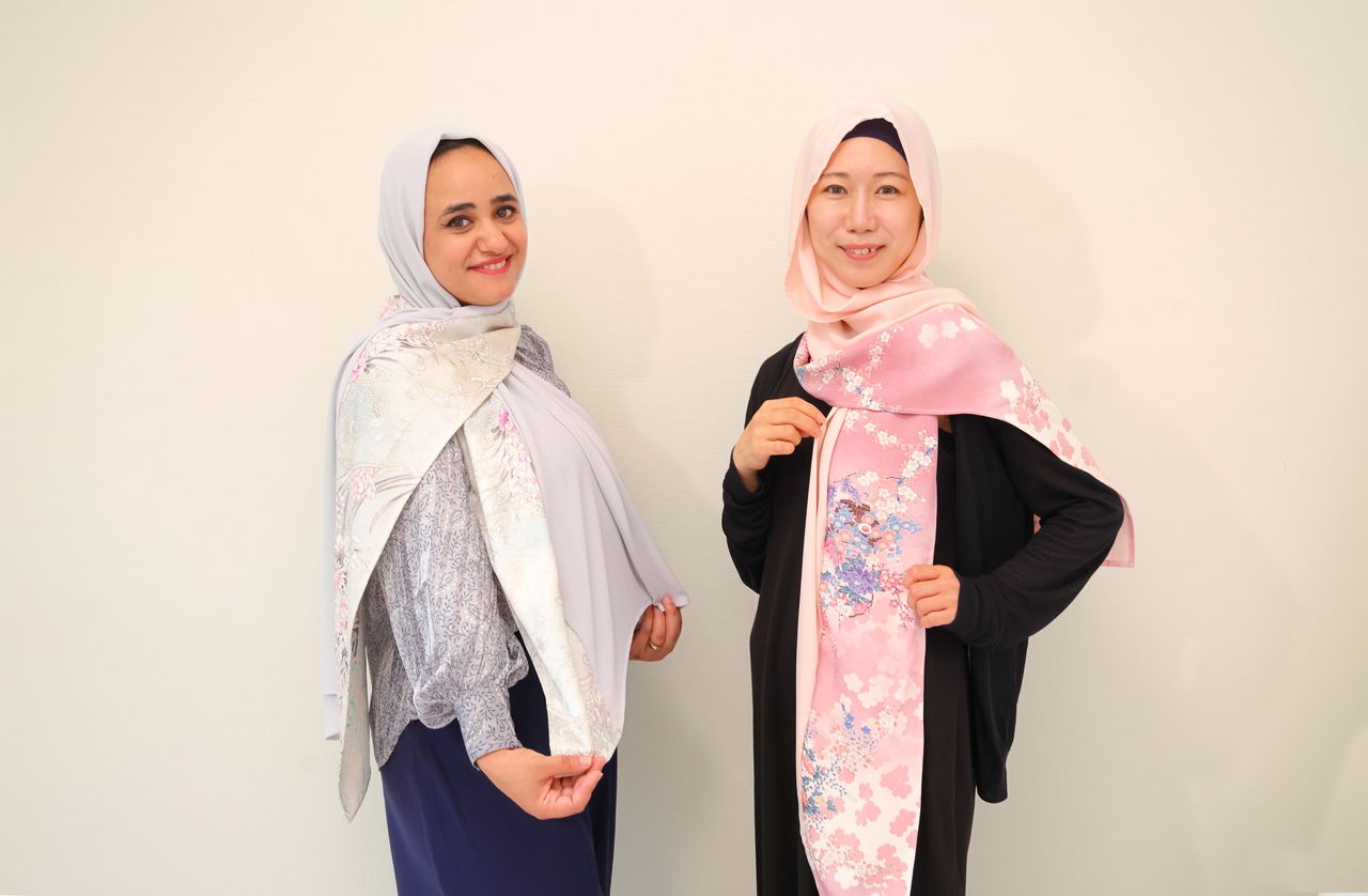 La encargada de la sección de árabe de nippon.com se prueba un hiyab hecho con tela de kimono.