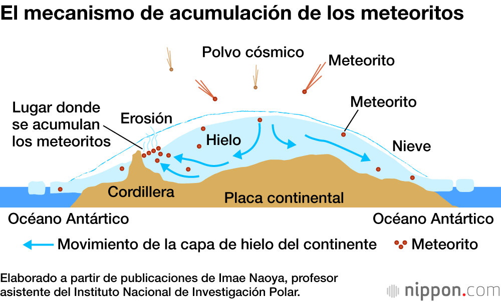 ¿Por qué se encuentran tantos meteoritos en la Antártida? La clave está en los movimientos y la topografía de la gigantesca y gruesa capa de hielo que cubre el continente. Los meteoritos que se precipitan desde la atmósfera quedan integrados, junto con la nieve, en esa capa de hielo, que se desplaza lentamente desde el interior hacia la costa unos cuantos metros al año. Los meteoritos también se mueven con la capa y se ven transportados durante decenas de miles de años. Normalmente, al llegar a la costa, el hielo se convierte en icebergs que se deshacen en el mar, pero en su trayecto hacia la costa puede verse interceptado por obstáculos como cadenas montañosas. Cuando el hielo se queda atorado en un lugar, los fuertes vientos (vientos catabáticos) lo erosionan o lo transforman en vapor y los meteoritos que contiene salen a la superficie.
