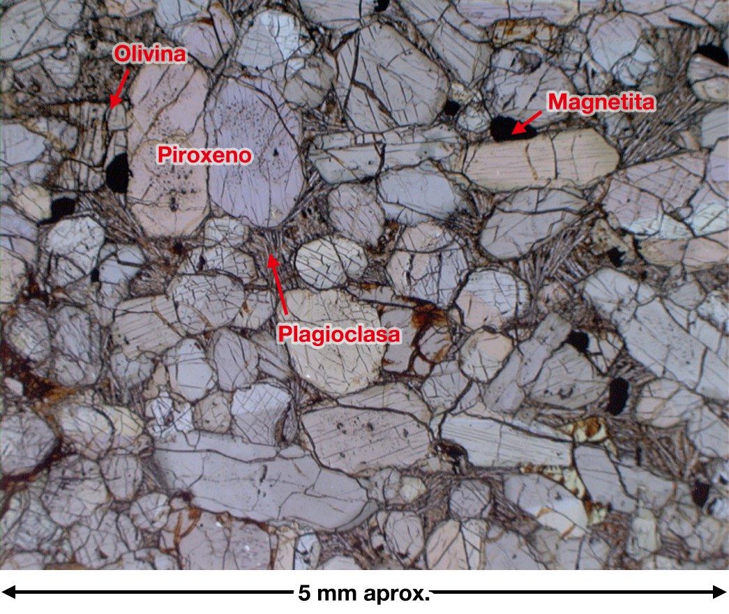 Un fragmento de Yamato 000593 fotografiado con un microscopio óptico. Parte de la olivina del interior se transformó y está combinada con minerales arcillosos, lo que demuestra la existencia pasada de agua en la superficie de Marte.