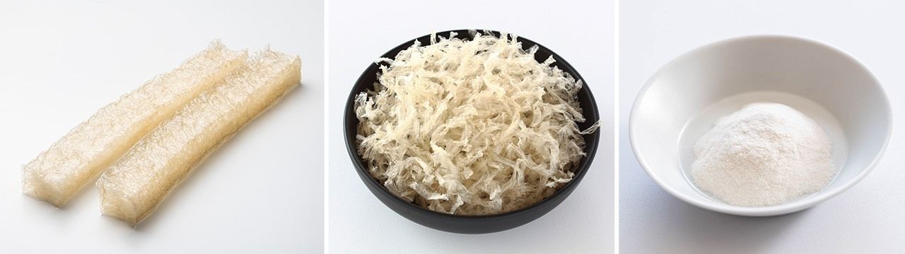 De izquierda a derecha: kanten en bloque, kanten con forma de fideos y kanten en polvo. (Pixta)