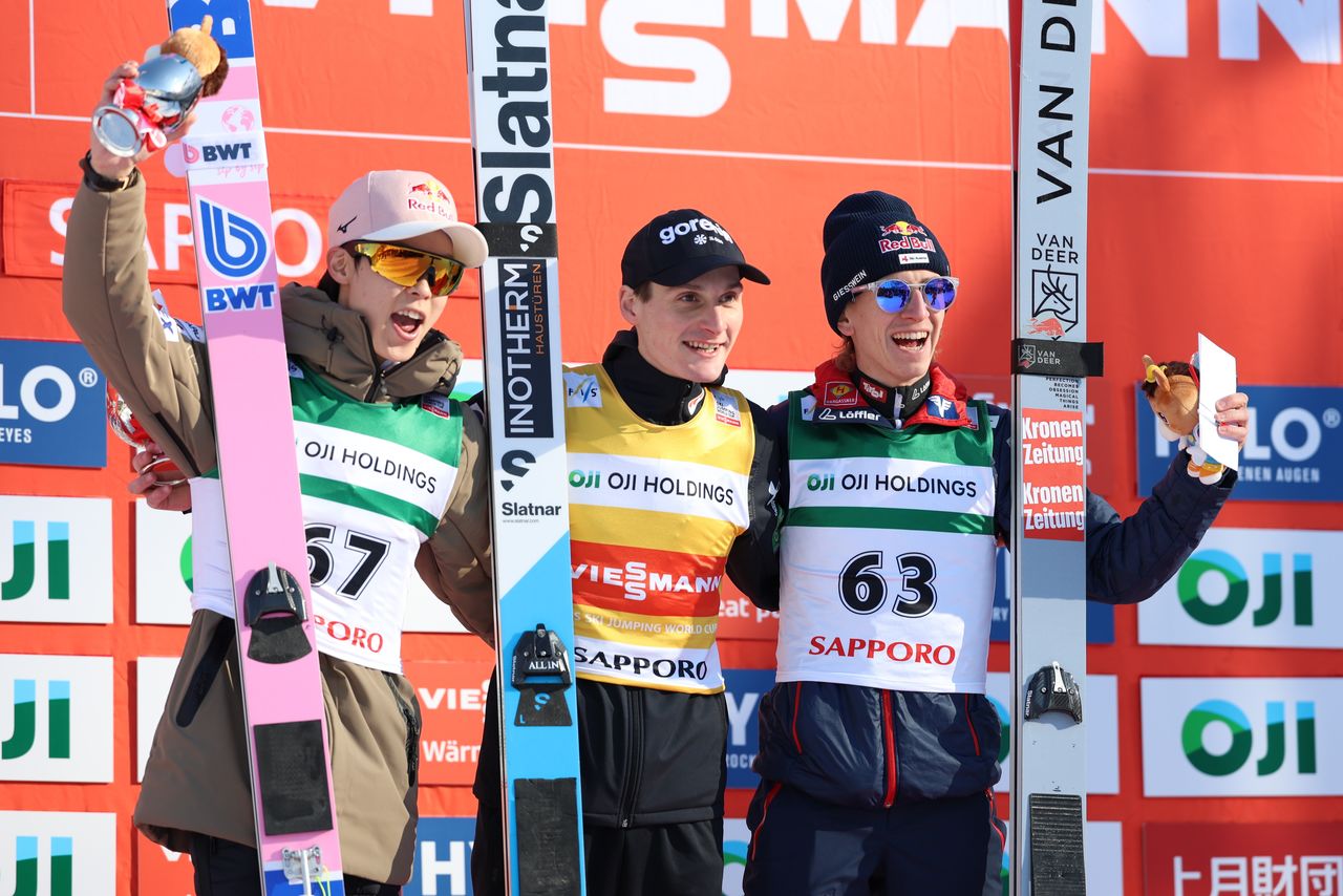18.ª prueba individual masculina de saltos de esquí de la Copa del Mundo de Esquí Nórdico. Kobayashi Ryōyū (izquierda) en el podio tras quedar segundo. En el centro, el ganador Domen Prevc (Eslovenia). 18 de enero de 2026, Estadio de Saltos de Ōkurayama, Sapporo (Jiji).