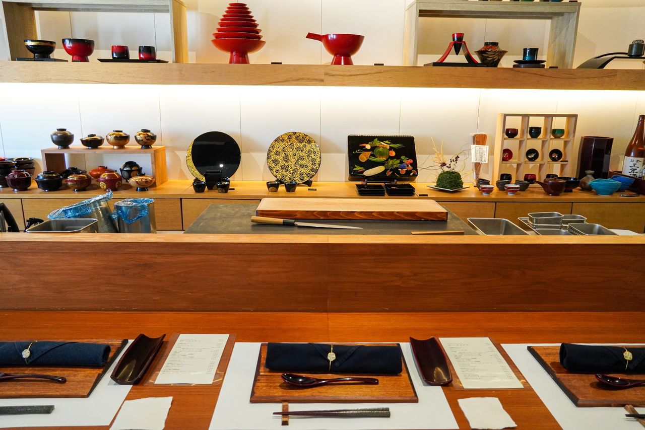 La vajilla lacada utilizada en el menú degustación puede alcanzar un valor de hasta dos millones de yenes. Muchos clientes quedan tan impresionados por la sensación de la laca adaptándose suavemente a sus manos que deciden comprar piezas en el mismo momento.
