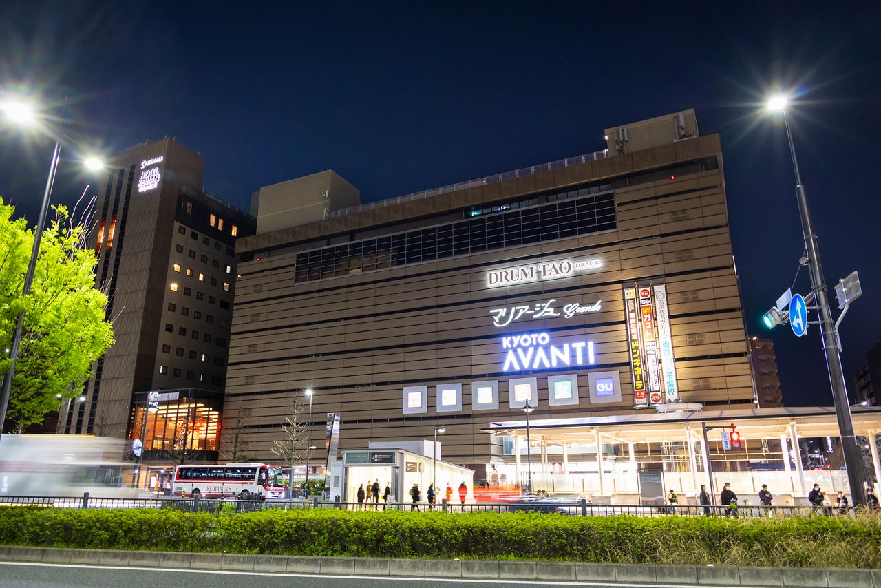 Imagen del edificio Avanti, donde se encuentra el teatro, realizada desde la salida Hachijō de la estación de Kioto. El edificio conecta directamente con la estación mediante un pasaje subterráneo.