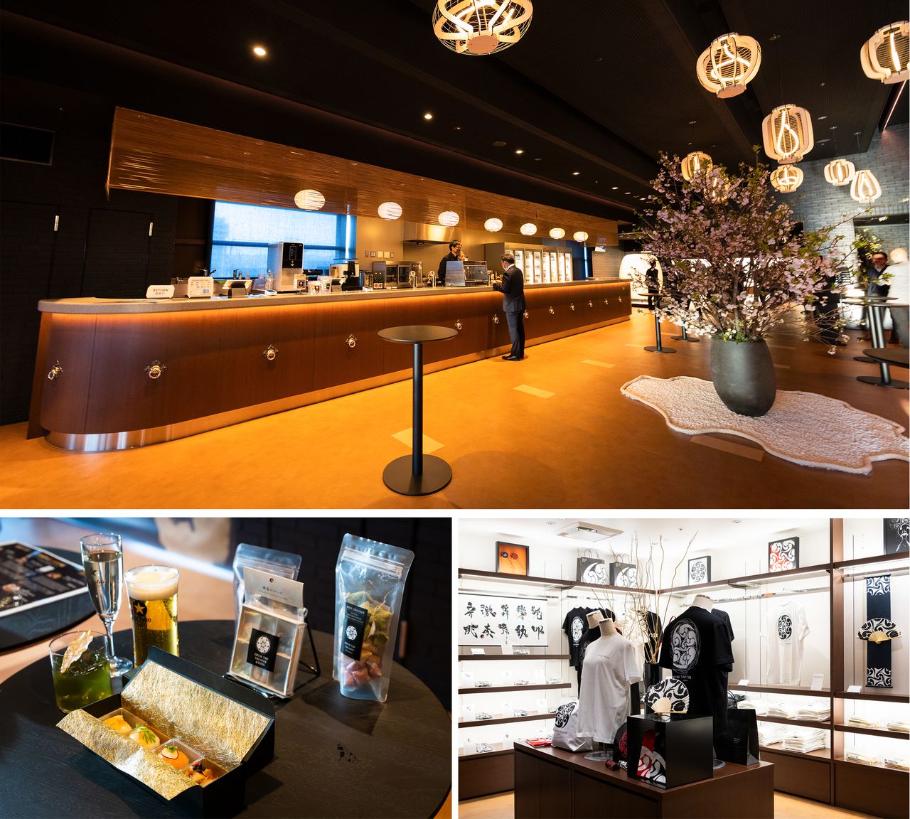 La barra de bar de estilo retro (arriba) y las bebidas y comida creadas en colaboración con famosos establecimientos de Kioto (abajo a la izquierda). La tienda de regalos cuenta con una amplia selección de artículos originales de estilo japonés (abajo a la derecha).
