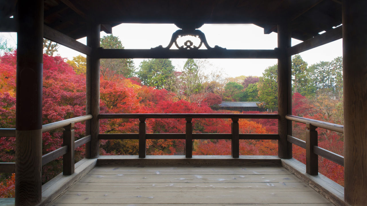 Las hojas rojas dan color al estanque en el que nadan las carpas nishikigoi. Este y el de la pagoda son dos paisajes representativos del Eikandō otoñal.