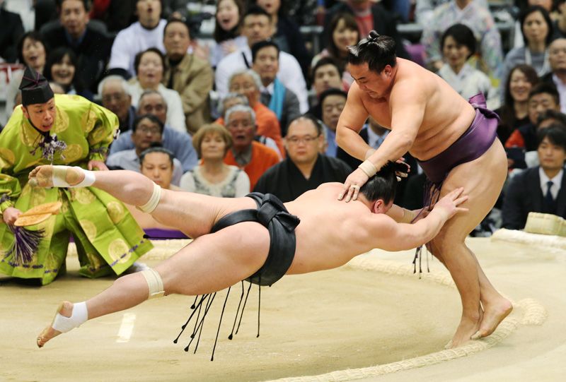 El luchador Sōkokurai (nacido en la región autónoma de Mongolia Interior, China) logró vencer al yokozuna Harumafuji mediante un hatakikomi en el tercer día del Gran Torneo de Sumō de Primavera. Para este luchador de 33 años supone su primer kinboshi, expresión que significa “estrella dorada” en japonés y que en sumō hace referencia a la victoria de un luchador de una categoría inferior sobre un yokozuna. Sōkokurai fue obligado a abandonar su carrera deportiva en 2011 tras ser acusado de participar en amaños de combates, pero logró volver dos años después al mundo del sumō como maegashira (luchadores de la división superior sin categoría asignada) tras demostrar su inocencia en los tribunales. El combate tuvo lugar el 14 de marzo en el Edion Arena de Osaka. (© Jiji)