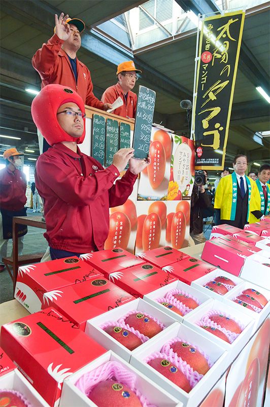 El 13 de abril fueron puestos a la venta los mangos maduros Taiyō no tamago (Huevo del sol), una fruta de primera calidad cultivada en la prefectura de Miyazaki. Esta fruta salió a subasta en los mercados de la prefectura de Miyazaki y en las ciudades de Tokio y Osaka, entre otros lugares. En el mercado central de la ciudad de Miyazaki una caja con dos mangos (de aproximadamente medio kilo cada uno) cultivados en la ciudad de Saito superó la cifra récord del año anterior alcanzando los 400.000 yenes. Por la tarde esta fruta se pondrá a la venta en los grandes almacenes de Fukuoka. Estos mangos se recogen de una red en la que caen cuando han alcanzado su punto de madurez. Solo un 15 % de los mangos recolectados cumplen los siguientes criterios para ser puestos a la venta como la variedad Taiyō no tamago: un color y forma característicos, un peso superior a los 350 gramos y un nivel de azúcar superior a 15 grados, entre otras cualidades. La Cooperativa Agrícola de Miyazaki (JA Miyazaki Keizairen) asegura que al igual que en años anteriores, este año se alcanzará una calidad óptima. Las cosechas llegarán a su punto álgido entre el mes de mayo y junio. (Jiji)