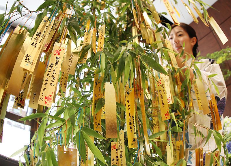 Con motivo de la celebración del Tanabata, el antiguo establecimiento especializado en metales preciosos Ginza Tanaka expone un bambú en el que las personas que visitan la tienda pueden colgar tiras tanzaku doradas después de escribir un deseo en ellas. Es el 17.º año que el local celebra esta actividad pensada para que incluso los visitantes extranjeros puedan deleitarse con esta tradición típica de Japón. El establecimiento pondrá a disposición de los clientes estas tiras tanzaku hasta el día 7 de junio. Tras finalizar el Tanabata, estas tiras serán llevadas a un santuario de Tokio para pedir que todos los deseos se cumplan. (Jiji)