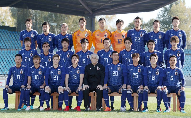 La selección masculina de fútbol de Japón posa con su nuevo uniforme para Rusia 2018 durante su visita a Lille, en Francia, el 7 de noviembre. En el centro, el seleccionador Vahid Halilhodžić. (Jiji)