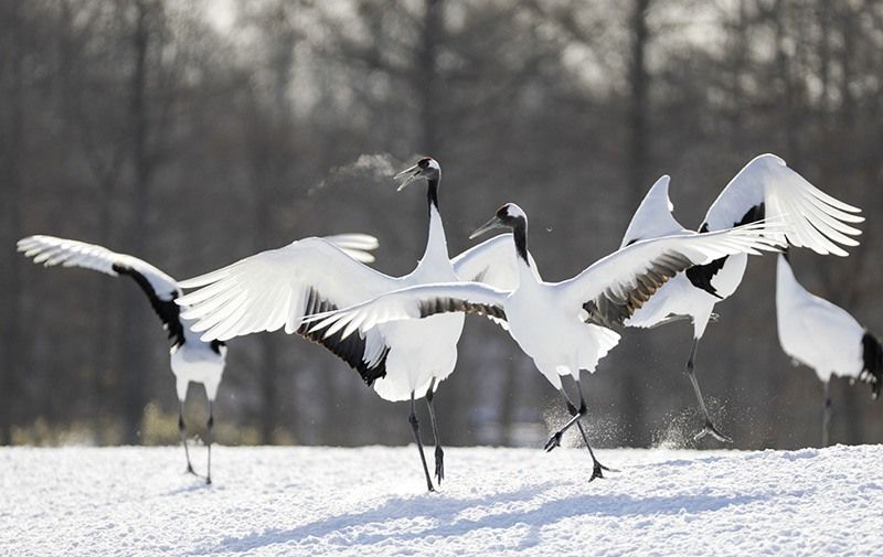 Las grullas de Manchuria, designadas Monumento Natural Especial, ofrecen estos días su majestuosa danza en los paúles. En la lengua ainu estas grullas son llamadas sarurun kamuy (los dioses de los paúles). El pasado 3 de febrero se pudo ver a machos y hembras hacer su danza de cortejo en unas gélidas temperaturas por debajo de los 19 grados en el Santuario de Grullas de Tsurui-Ito en el pueblo de Tsurui, en Hokkaidō.