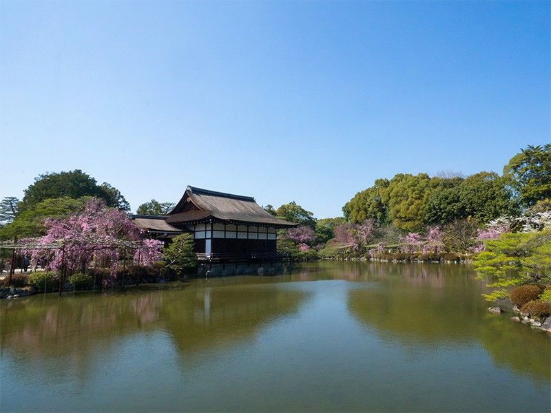 Los árboles benishidare rodean a la casa de invitados Shōbikan situada en el lado este del terreno del santuario. Los cerezos en flor se reflejan en el agua, regalándonos un hermoso paisaje.