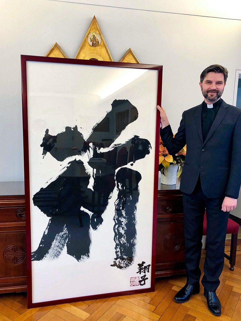 Monseñor Veceslav Tumir acepta la obra de arte donada por Kanazawa Shōko en la nunciatura apostólica del Vaticano, o misión diplomática, en Tokio. (Por cortesía de la agencia de Kanazawa Shōko)