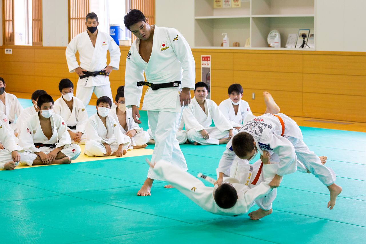 Inoue Kōsei y Haga Ryūnosuke enseñan judo a menores evacuados de Ucrania
