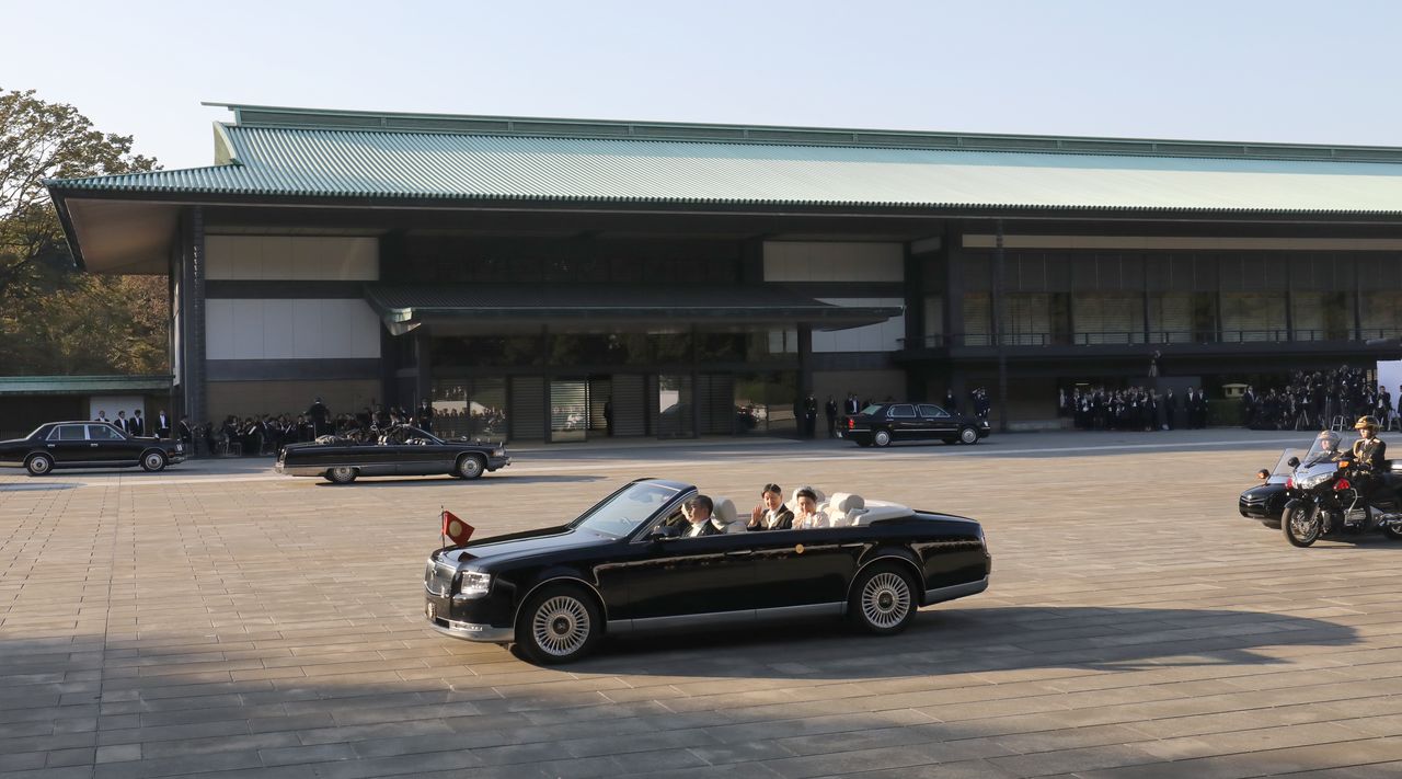 La hilera de vehículos de la ceremonia del desfile en los terrenos frente al Palacio Imperial. (Jiji)