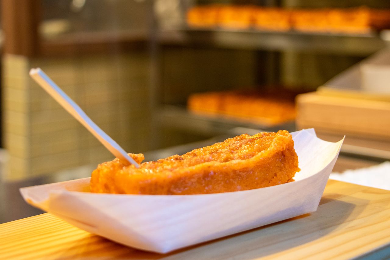 La tienda Marutake es famosa por su tortilla tamagoyaki, por la que numerosos clientes hacen cola en el mercado exterior de Toyosu. Vende también dulces como pudín de natillas y bizcocho esponjoso castella. (© Nippon.com)