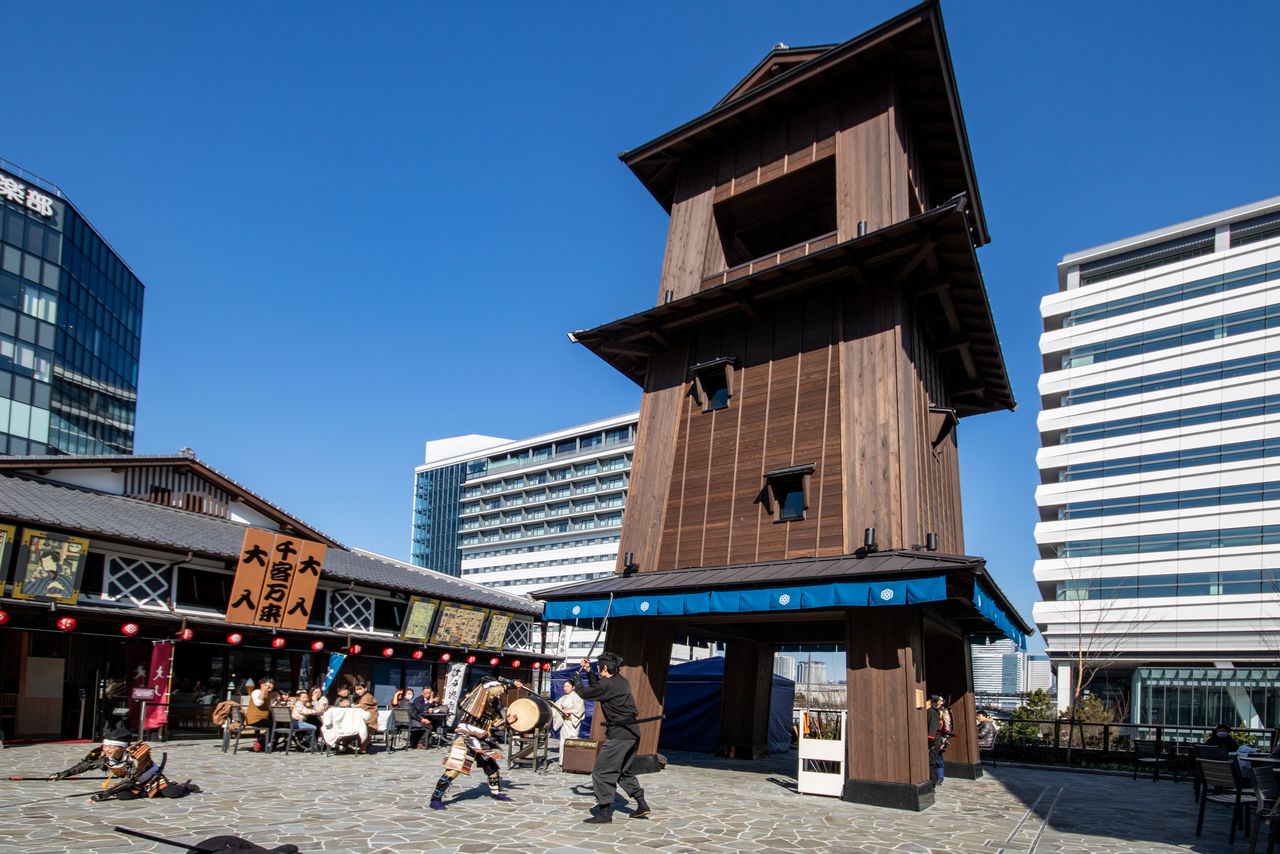 Actores representan una escena de pelea en una plaza frente a la torre de la Campana del Tiempo. Estos espectáculos podrán verse hasta finales de marzo. (© Nippon.com)