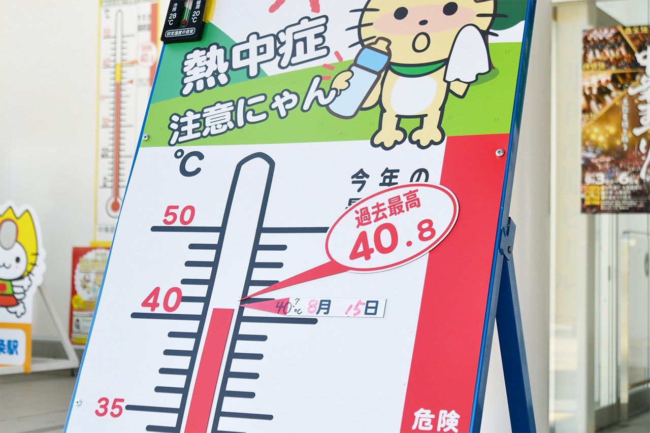 Un cartel advierte del riesgo de sufrir un golpe de calor y muestra una temperatura récord de 40,8ºC en Tainai, en la prefectura de Niigata, alcanzada en agosto de 2018. La temperatura de 40,7ºC del 15 de agosto de 2019 es la más alta registrada durante el presente año. La fotografía fue tomada en la estación de Nakajō ese mismo día. (© Jiji)
