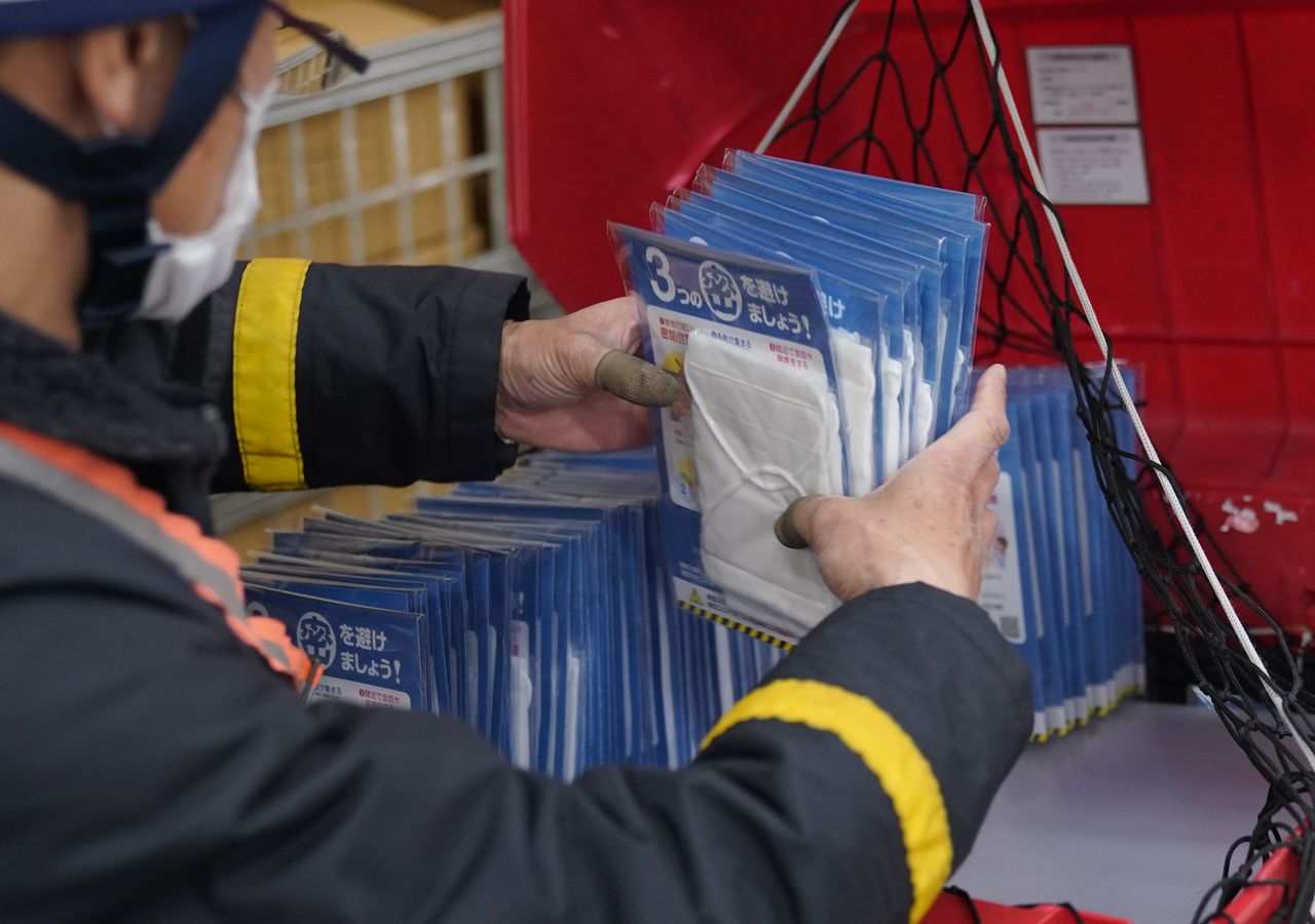 Un empleado del servicio postal ordena sobre una motocicleta de reparto varias de las mascarillas que serán enviadas a los hogares japoneses. En Setagaya, Tokio, el 17 de abril. (© Jiji)