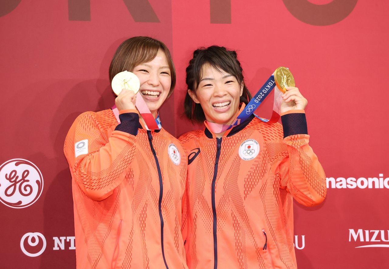Las hermanas Kawai Yukako (a la izquierda) y Risako con sus medallas de oro olímpicas en la prefectura de Chiba el 5 de agosto de 2021. (© Jiji)