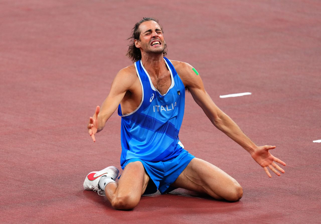 Foto del domingo del italiano Gianmarco Tamberi celebrando tras el oro compartido en salto en alto con el qatarí Mutaz Essa Barshim