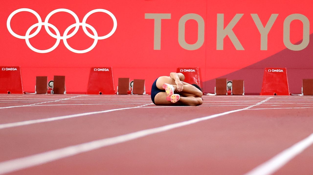 Foto del miércoles de la británica Katarina Johnson-Thompson tras lesionarse en la prueba de heptatlón.