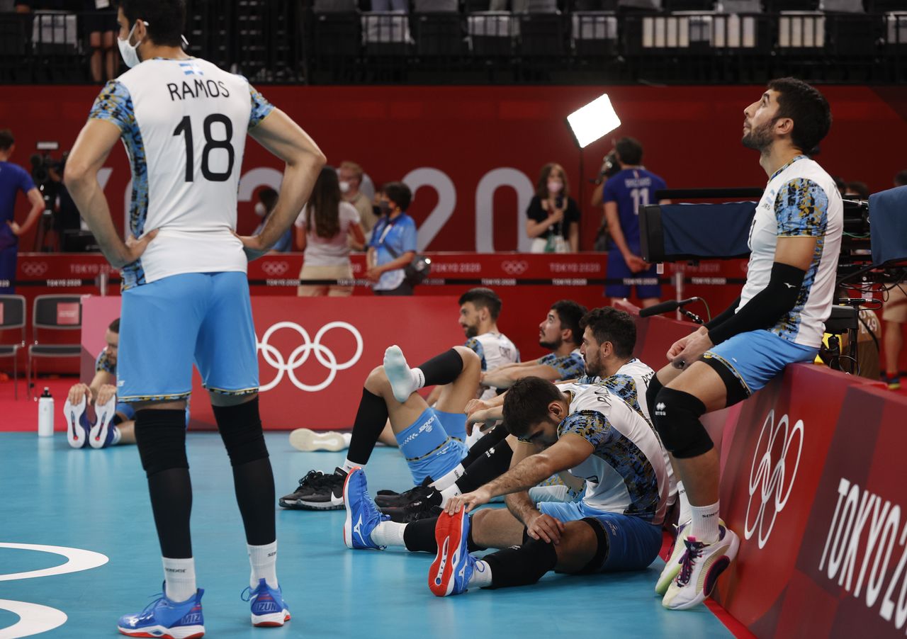 Foto del jueves de varios jugadores de la selección argentina de voleibol tras la derrota ante Francia en semifinales.