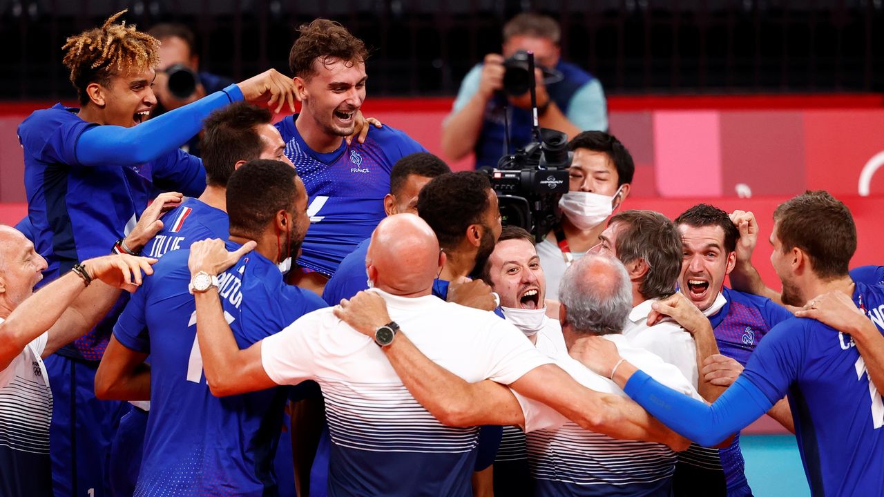 Foto del jueves de la selección de voleibol de Francia celebrando la victoria sobre Argentina en las semifinales de los Juegos Olímpicos.