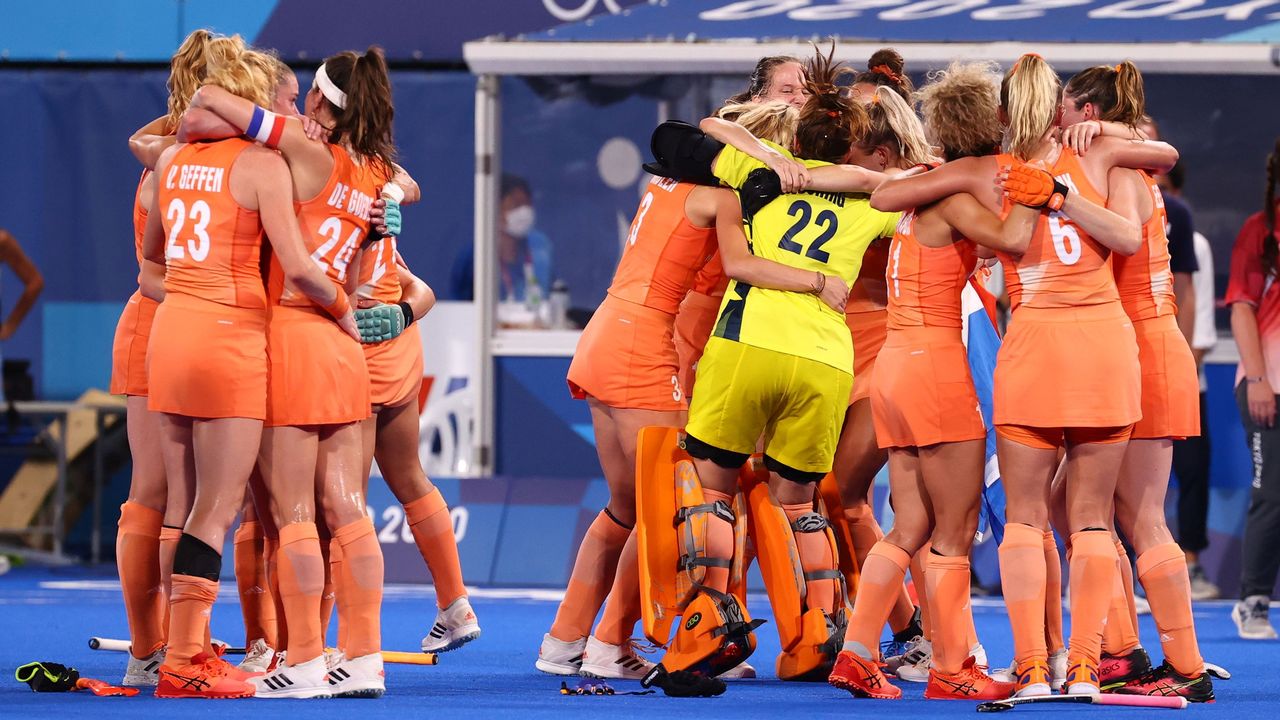 Foto del viernes de las jugadoras de Países Bajos celebrando el oro en hockey sobre césped.