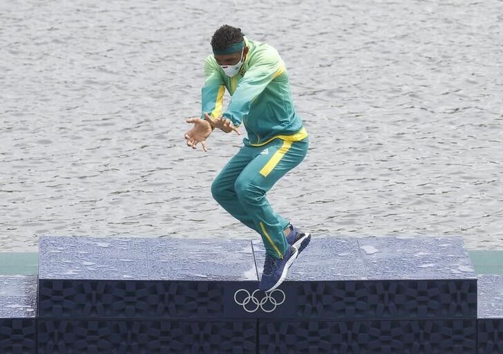 Ago7, 2021. Foto del sábado del brasileño Isaquias Queiroz Dos Santos celebrando el oro en la prueba C1 de canotaje.