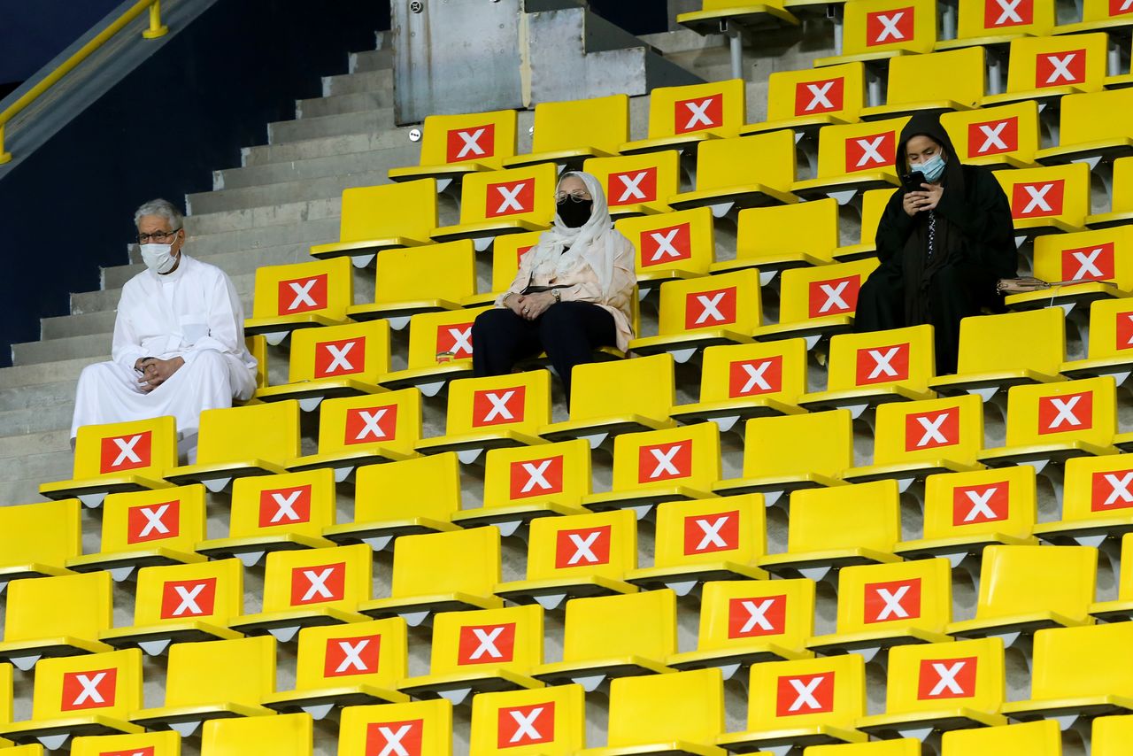 FOTO DE ARCHIVO: Tres personas con mascarilla asisten a un partido de fútbol en un estadio de Riad, Arabia Saudí, el 30 de marzo de 2021. REUTERS/Ahmed Yosri
