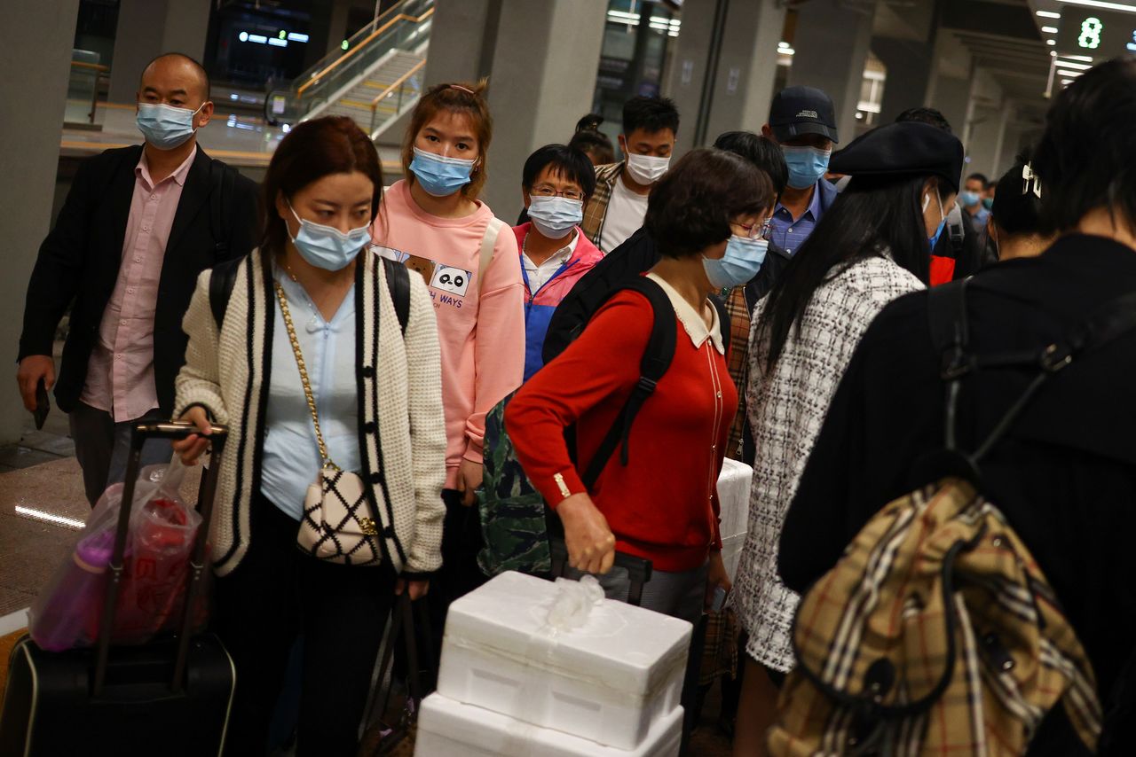 FOTO DE ARCHIVO: Viajeros llegan a una estación de tren antes de las próximas vacaciones de la Semana Dorada de China durante la epidemia de coronavirus, en Pekín, China, 29 de septiembre de 2021. REUTERS/Thomas Peter