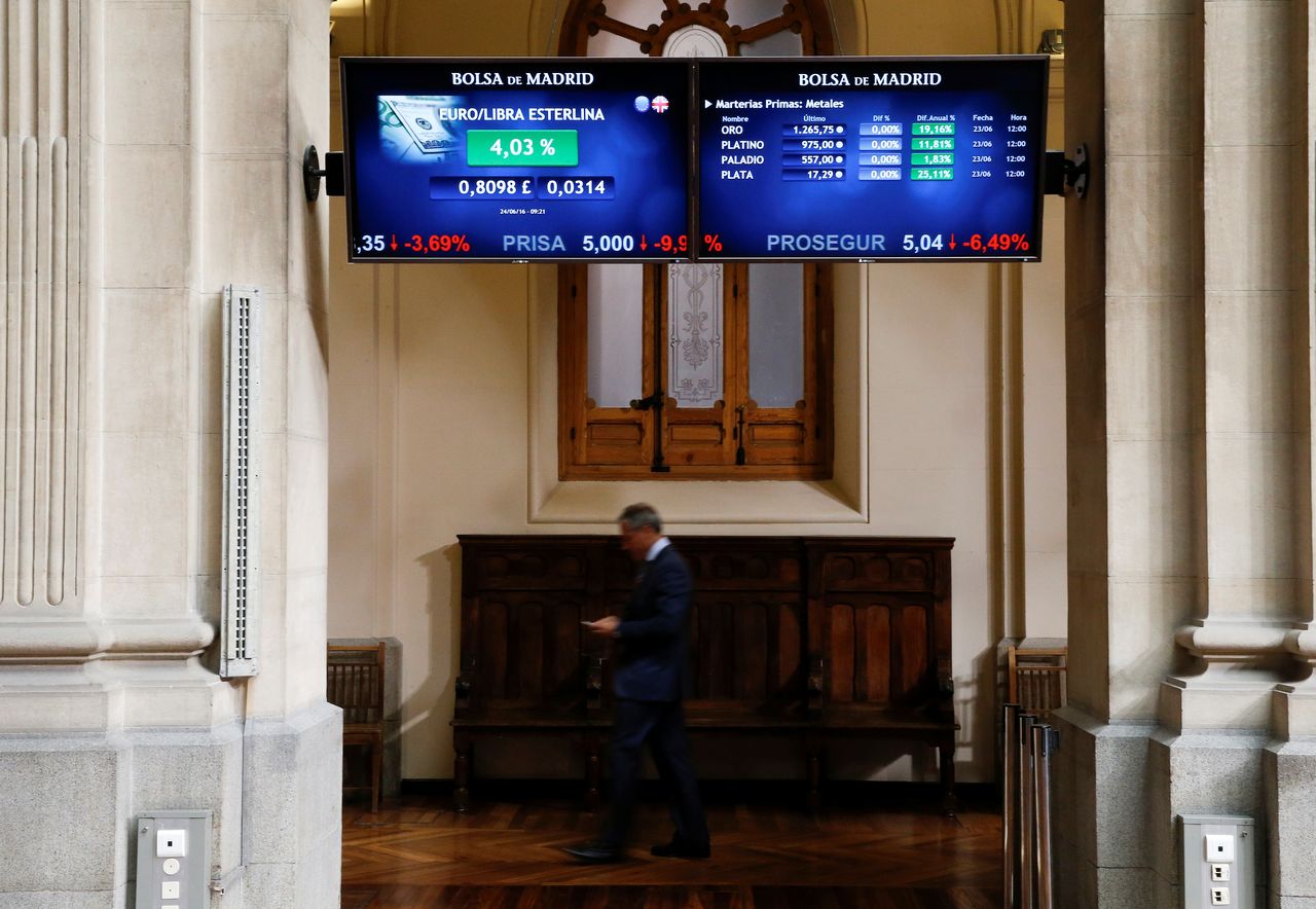 FOTO DE ARCHIVO: Pantallas con datos de cotización en el interior de la Bolsa de Madrid, España, el 24 de junio de 2016. REUTERS/Andrea Comas