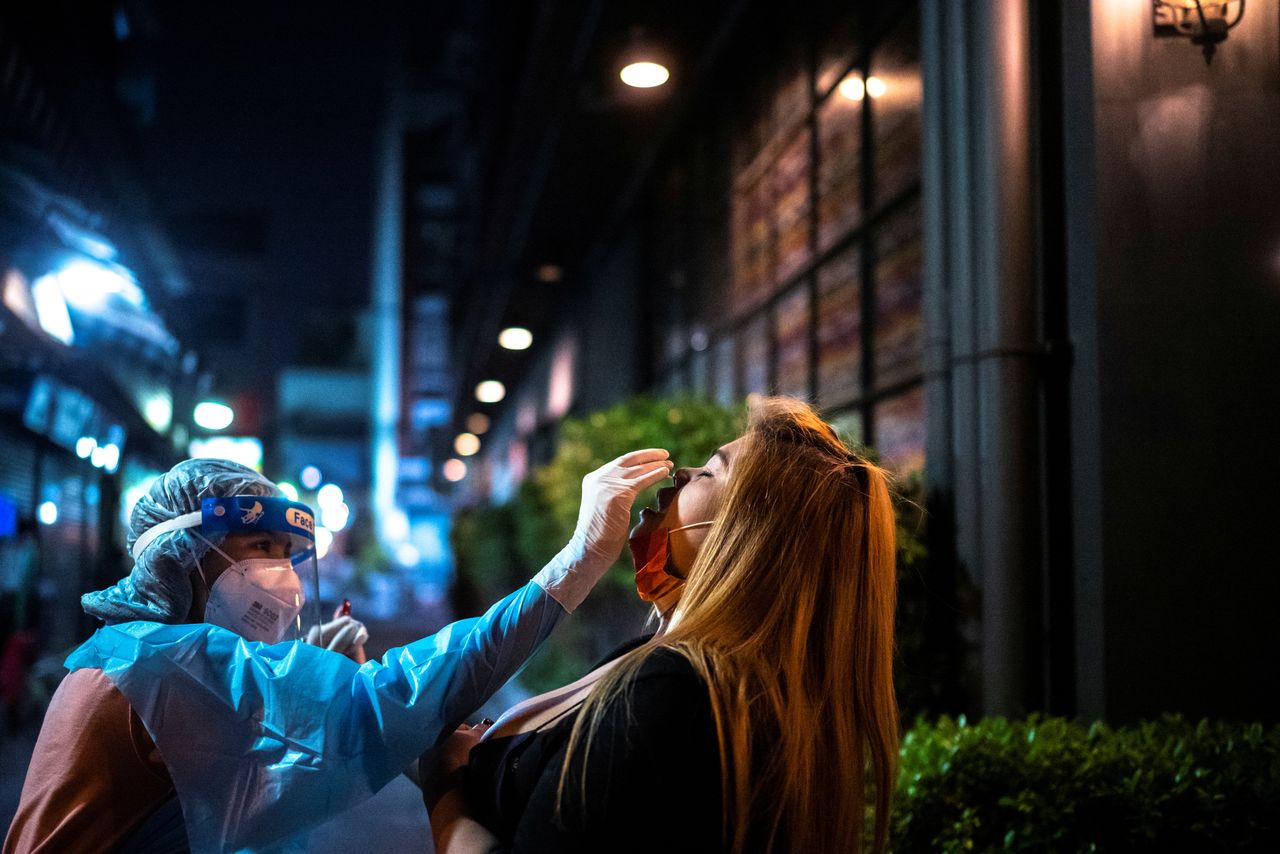 FOTO DE ARCHIVO: Un voluntario con equipo de protección personal (EPP) toma muestras de un hisopo de una persona para una prueba rápida de antígeno durante la epidemia del coronavirus (COVID-19) en el barrio chino de Bangkok, Tailandia, 13 de enero de 2022. REUTERS/Athit Perawongmetha
