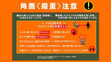 Según la prefectura, una mayoría de los incidentes se produjeron al tocar a los ciervos al darles de comer galletas (shika senbei), y en septiembre 10 personas tuvieron que ser trasladadas al hospital, una de ellas con una herida de varios centímetros en el muslo.