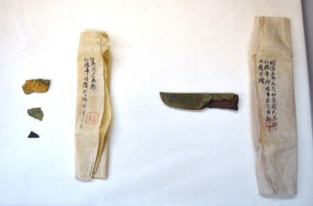 Según el grupo, la armadura y otros artículos se hallaron en el túmulo a comienzos del período Meiji (1868-1912). Se cree que la mayoría de estos objetos fueron enterrados de nuevo, pero algunos estaban en posesión de Kashiwagi Kaichirō, que coleccionaba y estudiaba artefactos históricos. La universidad compró su colección el año pasado.