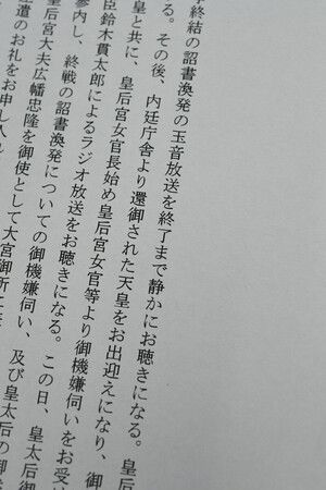 Según el documento, que consta de unas 3.800 páginas, la emperatriz Nagako pasó todo el día del 15 de agosto de 1945 (fecha en que Hirohito anunció la rendición de Japón) en un refugio subterráneo que en aquel entonces también servía como su residencia. Escuchó por radio el anuncio de la derrota realizado por el soberano.