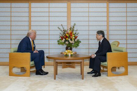 Trump llegó al palacio alrededor de las 18:30 horas en el coche presidencial. El emperador lo recibió sonriente a la entrada y ambos se estrecharon la mano antes de ingresar juntos en la residencia.