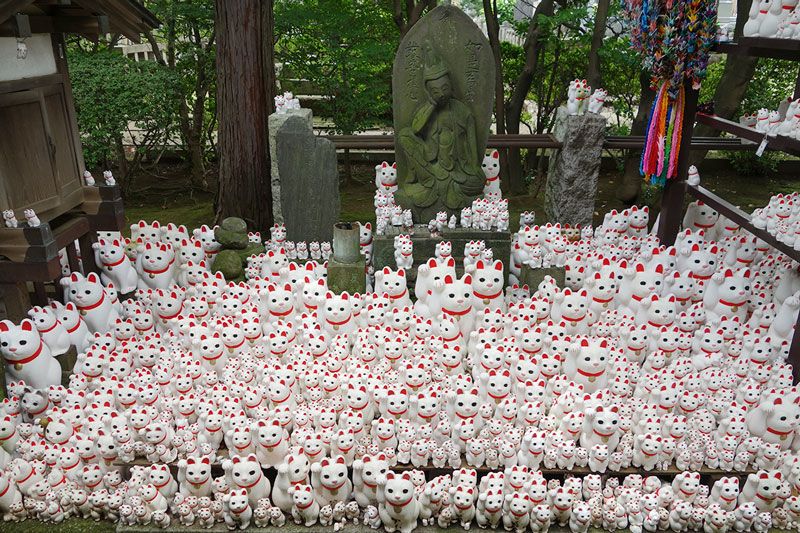 Se destinó una zona del templo para venerar al gato como una de las muchas manifestaciones de la Kannon Bodhisattva, la diosa (a veces dios) de la misericordia. Cuando se atendían sus plegarias, la gente realizaba ofrendas en forma de manekineko como agradecimiento. Así fue como nació la colección. Al principio debió haber una mayor mezcla de estilos, pero ahora los únicos gatos que está permitido depositar son los blancos aprobados por el templo.