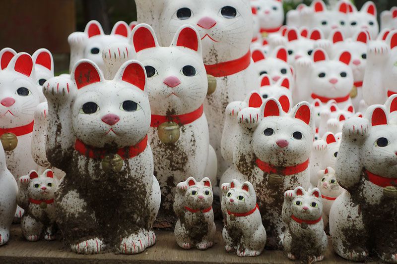 Hay quien dice que ahí es donde empezaron los gatos que invitan, pero hay muchas otras teorías. El santuario de Imado, también en Tokio, presume de una de las teorías más famosas, con su historia de una anciana que tuvo que deshacerse de su gato porque era tan pobre que no podía alimentarlo. El gato se le apareció en sueños y le aconsejó que fabricase figuritas de cerámica con su imagen. La anciana así lo hizo, y de esta forma nació el manekineko.