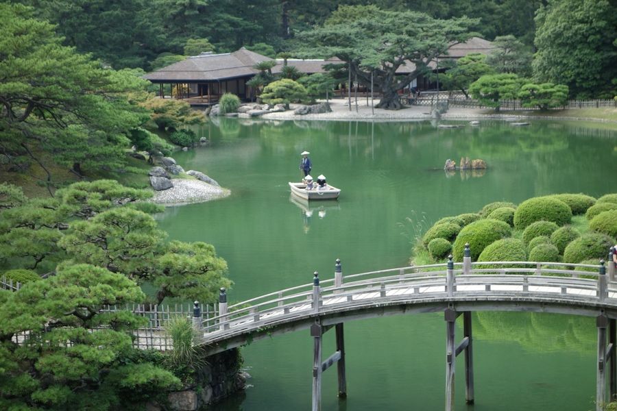 Hice mi primera parada en el Jardín Ritsurin, construido a mediados del siglo XVIII. Situado en Takamatsu, la capital de la prefectura de Kagawa, está considerado como uno de los jardines más bellos de Japón. En su punto más alto puede disfrutarse de una bonita panorámica, desde el puente en forma de media luna y las verdes aguas del estanque Nanko en un primer plano hasta un tradicional salón de té japonés medio oculto frente al arbolado Monte Shiun al fondo.