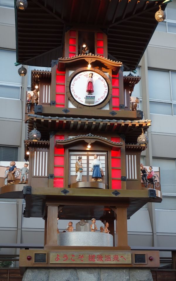 Una gran atracción para los turistas japoneses en Matsuyama son los baños públicos de Dōgo Onsen, que fueron una de las fuentes de inspiración de El Viaje de Chihiro de Miyazaki Hayao. También están entre un número de ubicaciones de Matsuyama asociadas con la clásica novela de Natsume Sōseki Botchan. Despúes de instalarme en la pensión Sen Guesthouse (cómoda y acogedora), a las seis en punto me detuve a observar el Reloj Botchan situado junto a las aguas termales, con los personajes de la novela moviéndose en varios niveles.