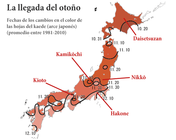 Los japoneses esperan el cambio de color de las hojas al comenzar el otoño. Los tonos rojos y naranjas se extienden primero por las montañas de Asahidake en el Parque Nacional de Daisetsuzan, en la prefectura de Hokkaidō, donde la época en la que pueden verse las hojas en su máximo esplendor dura hasta comienzos de octubre a baja altura.