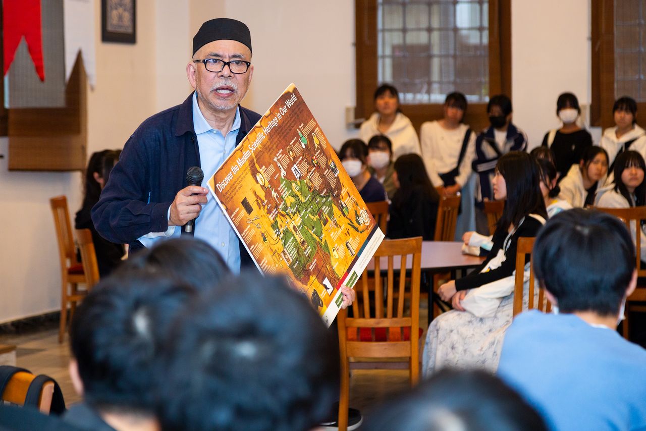 Shimoyama va captando el interés de los estudiantes ofreciéndoles ejemplos de inventos concebidos por personas musulmanas que tienen un papel importante en la vida cotidiana, como los números árabes y el principio de la cámara fotográfica. Una vez ha roto el hielo, pasa a explicar el contexto histórico y la filosofía del islam.