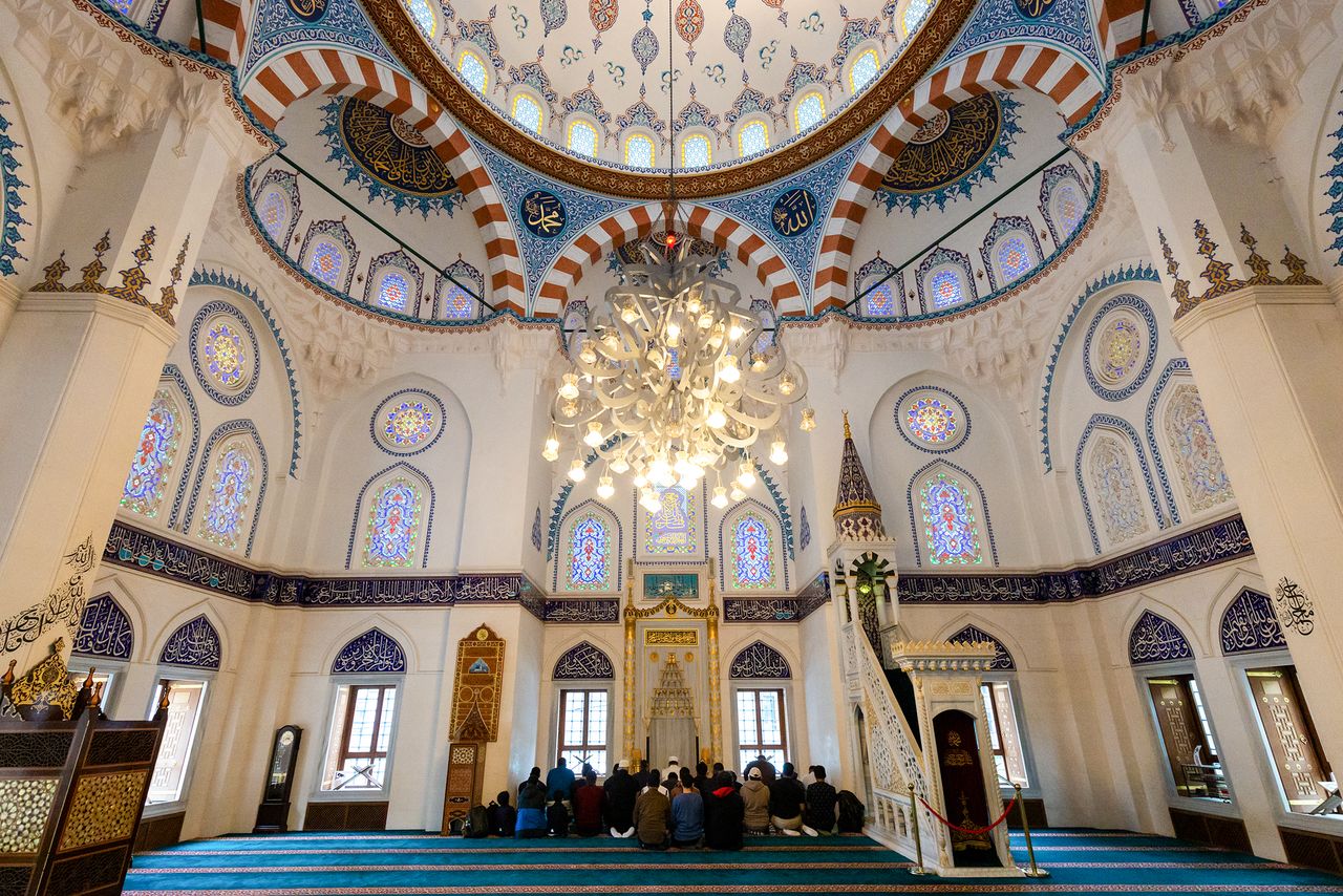 Bajo la cúpula de Tokio Camii, decorada con elementos como las magníficas vidrieras.