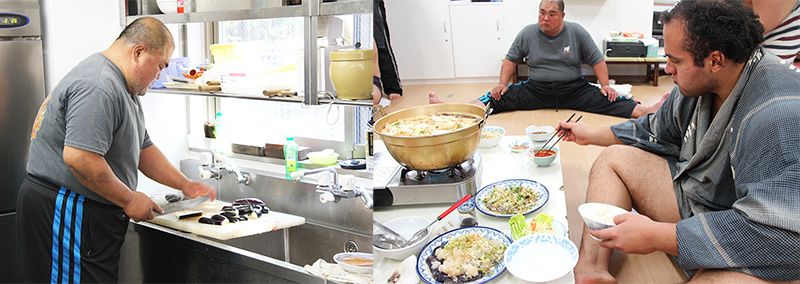 El chanko (un estofado que los luchadores de sumo ingieren en grandes cantidades) de Ōtake-beya se prepara siguiendo la opinión del ex luchador Yūhō (izq.). El término chanko también se aplica a la cocina casera que preparan los luchadores. A Ōsunaarashi le encanta el chanko que lleva carne de pollo (dcha.).