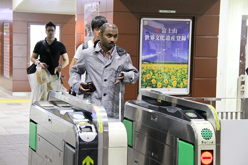 Abdin pasa el control de billetes en una estación de Japan Railways. Al equipo de reporteros nos costaba seguirle el ritmo.